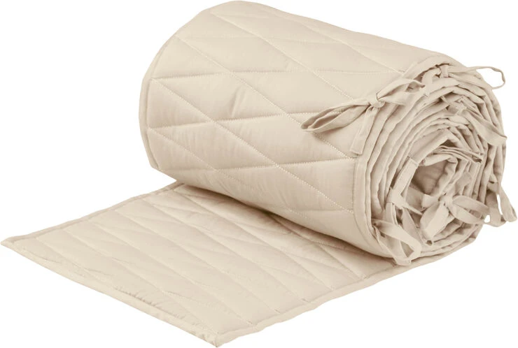 Blød, økologisk sengerand med blødt fyld indeni der skaber komfort, ro og tryghed for dit sovende barn. Sengeranden kommer i tre fine farver, med Cam Cam signatur ""Harlequin"" broderi navnet Harlequin refererer til det ikoniske rombeformede mønster, kendt og elsket fra den klassiske Pierrot La Lune ballet. Den kan overlappe, hvis den er lidt for lang. Montering Bind båndene på ydersiden af sengen og justér til. Klip overskydende bånd af, af sikkerhedsmæssige grunde. Bruger du ikke bindebåndene i bunden, skal disse klippes helt af, så baby ikke kan komme i kontakt med dem.