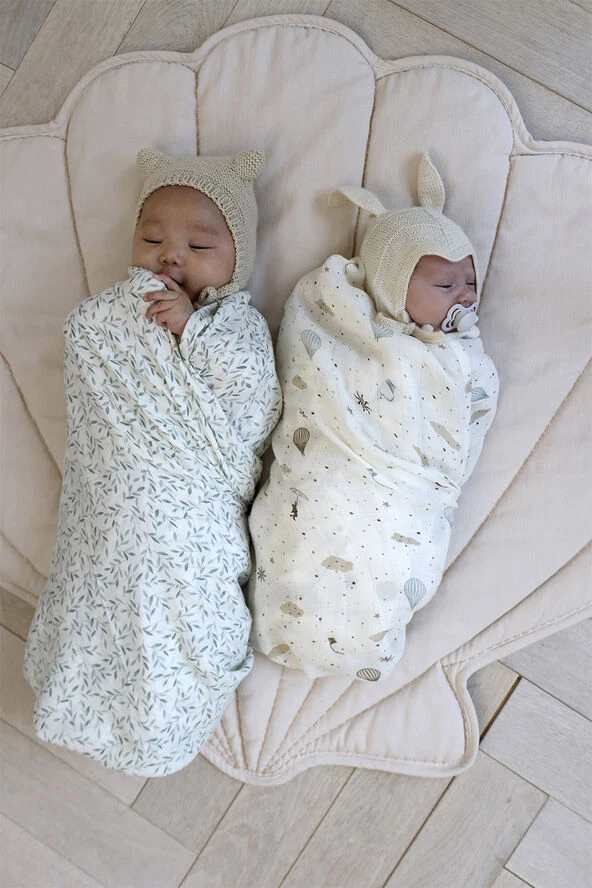 Svøb med print i 100% økologisk, GOTS-certificeret muslin bomuld til din baby. De fleste jordemødre og sundhedsplejersker anbefaler at svøbe babyer de første 3 måneder. Svøbte babyer falder lettere til ro og græder mindre. Svøb i hvide og brune nuancer.