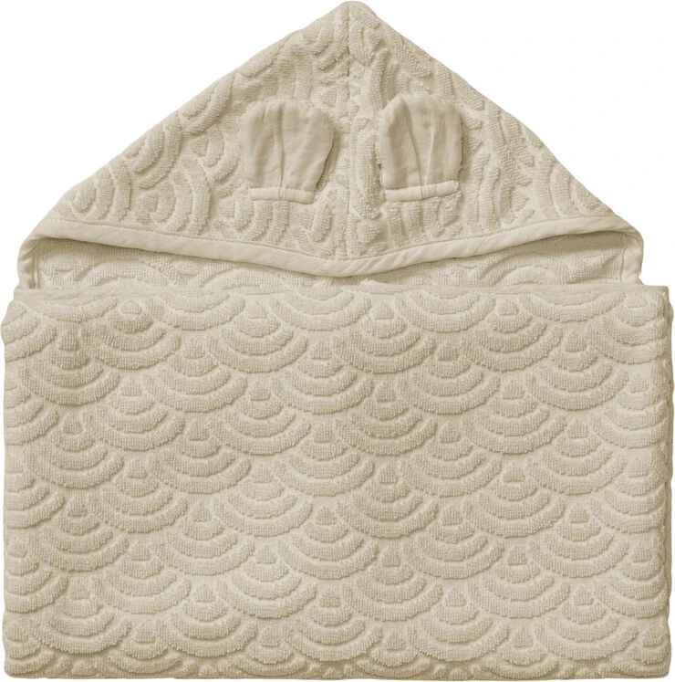 Blødt og tykt Junior Håndklæde i 100% GOTS-certificeret økologisk bomuld vævet i det klassiske Cam Cam bølgemønster. Håndklædet har en lille hætte med de sødeste små bjørneører og er perfekt til at pakke sig ind i efter et skønt bad. Med sin dejligt store størrelse på 70 x 130 cm er håndklædet velegnet til brug både på badeværelset og stranden samt ved poolen. Bølgemønsterets luftige design får håndklædet til at tørre hurtigt.