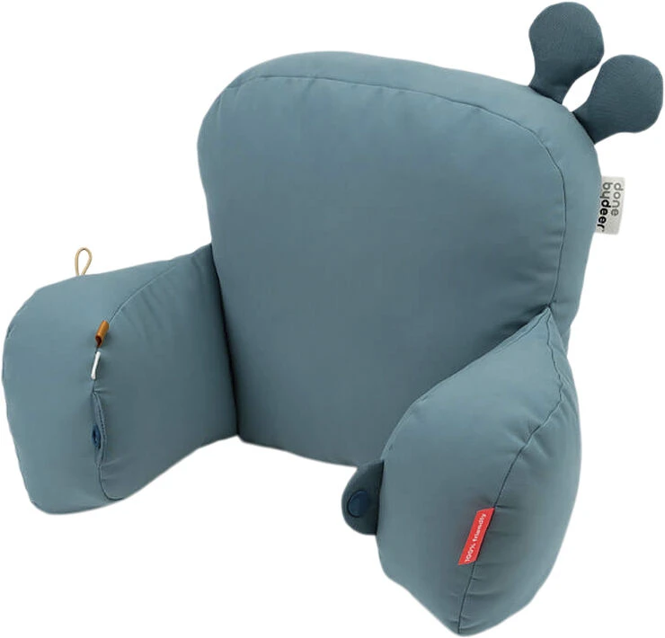 Når din baby er klar til at udforske verden fra barnevognen, kan Raffi barnevognspuden støtte, og gør det behageligt at sidde selv. Raffis sjove girafhorn, praktiske elastik-løkke til fastgørelse af sutter eller legetøj og farverige mærker underholder dit barn, når I er på farten. De små vil nyde at tage på tur med den søde blå giraf barnevognpude.