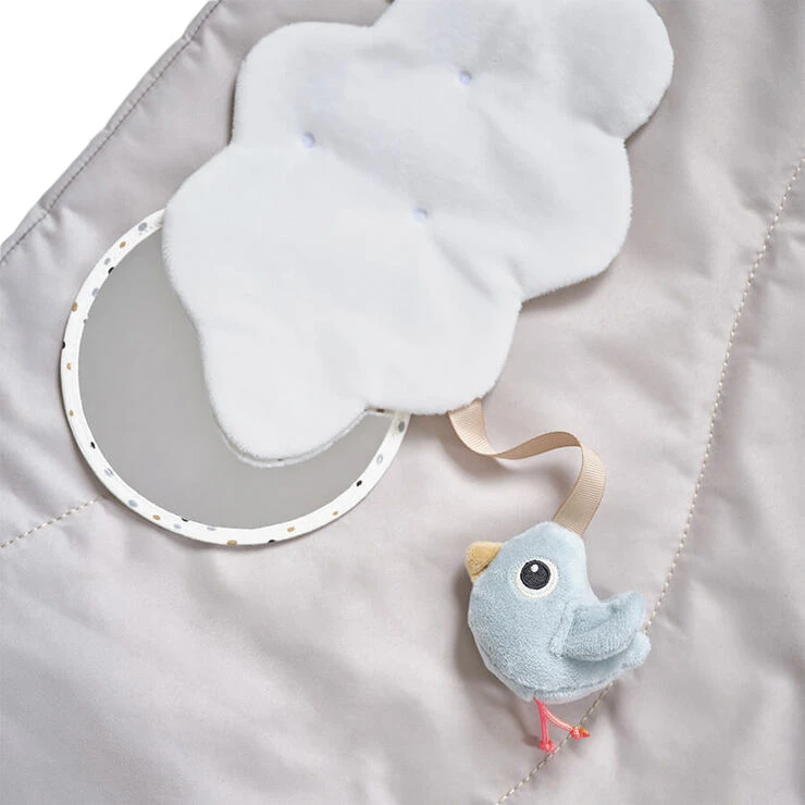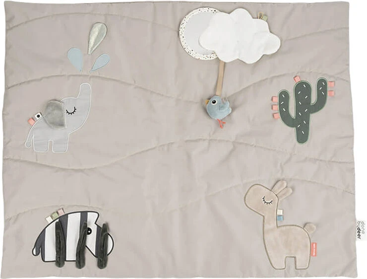 Din baby kan ligge blødt og behageligt på Deer friends sanselegetæppet. Legetæppet har et hav af aktiviteter og stimulerende features. Et legetæppe, der er perfekt til nakketræning og som er sjovt for barnet at udforske både liggende og senere siddende. Leg gemmeleg med Zebee, der titter frem bag de grønne blade. Nus med den bløde Lalee og hør den sjove ranglelyd, som fuglen laver når den flyver ind under skyen. Smil til det søde ansigt i det aftagelige spejl, og opdag den knitrende lyd fra Elphees øre. Det søde Deer friends legetæppe i lyse beige toner med detaljer i blå og grøn er vaskbart ved 30 grader i vaskemaskinen. Husk blot at fjerne det lille spejl inden vask.