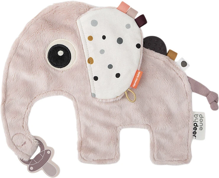 De mindste kan putte og hygge med denne bløde Elphee nusseklud. De små fingre fanger nemt Elphees lange snabel og kan udforske de farverige mærker og forskellige teksturer og former. Den søde silikone bidering stimulerer og beroliger kløende gummer. Den søde elefant sørger for at sutterne altid er inden for rækkevidde, både til sovetid og på farten. En praktisk Velcro clips og elastik-løkke kan holde styr på både sutter med og uden hank. En beroligende Deer friend til din baby, i pudderfarvede nuancer med små detaljer, kontrastfulde prikker og mærker der stimulerer babys sanser.