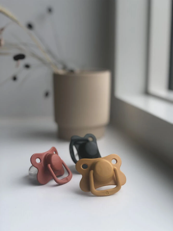 Filibabba Moments sut med symmetrisk suttehoved lavet af silikone. Sutterne findes i 15 smukke farver og i to forskellige størrelser, 0-6 mdr. og +6 mdr.