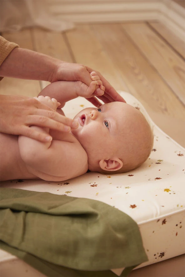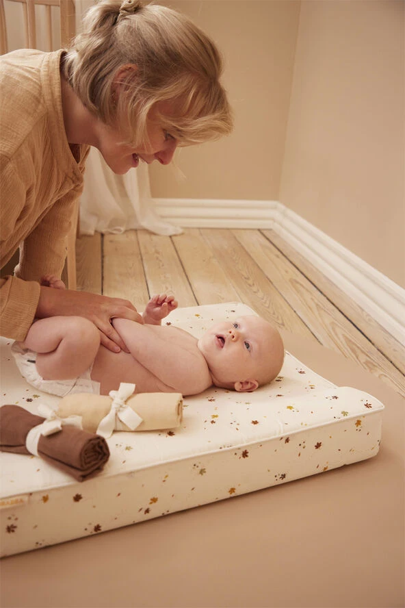 Hvem elsker ikke de store farverige blade og de skinnende kastanjer, der gemmer sig som små perler i deres grønne skal? Vores Chestnut print viser årstidens budbringere, som du kan finde på en skattejagt i det dejlige efterårsvejr. Kom med og se, hvad der gemmer sig i skovbunden! Vores skønne puslepude er fremstillet i økologisk satinvævet bomuld med en polyesterskumkerne. Derudover har vores puslepude et PU-lag (polyurethan), som gør puslepudens overflade vandafvisende og nem at tørre af efter bleskift. Er uheldet ude, hjælper den skjulte lynlås dig med at tage betrækket hurtigt af, så du kan vaske det efter behov. Husk at trække betrækket i form og putte det direkte på skumkernen efter vask. Lad betrækket tørre på sengeranden for at mindske risikoen for, at det krymper.