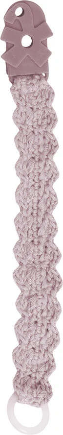 Håndhæklet suttekæde i økologisk bomuld med Sebra clips i plast – her i farven blossom pink. Da dette produkt er håndhæklet, er hvert produkt unikt, hvorfor der også er variationer i udtrykket. Suttekæden er nem at fastgøre med den smarte klemmefunktion og sikrer, at sutten ikke falder på jorden. Den håndhæklede suttesnor har i den ene ende en silikonering til fastgørelse af sutten, mens den i den anden ende har en klemme med ""tænder"" i stærkt POM-plast, som gør fastgørelse i barnets tøj let. Begge plastmaterialer er naturligvis fri for BPA og ftalat. Suttekæden er testet i henhold til standarden: EN 12586:2007 + A1:2011 og overholder kravene, herunder korrekt længde på snoren samt sikkert pynt. Den hæklede suttekæde er designet i Danmark, er håndlavet og derfor er hver suttekæde unik og med hver sin charme. Advarsel. Må ikke anvendes i nærheden af åben ild. For dit barns sikkerhed. ADVARSEL! Kontroller altid sutteholderen omhyggeligt før brug. Kassér sutteholderen ved første tegn på skade eller slitage. Forlæng aldrig sutteholderen fast til snore, bånd eller løse dele af tøjet, da barnet kan blive kvalt. Brug kun tøjfastgørelsen til at fæstne suttekæden – må aldrig bruges med fx. en sikkerhedsnål. Fastgør den ikke til andet end barnets tøj. Fjern suttekæden, når den ikke er i brug. Brug ikke suttekæden, når barnet er i fx. en seng, vugge eller kravlegård. Brug ikke sutteholderen som legetøj eller bidering.